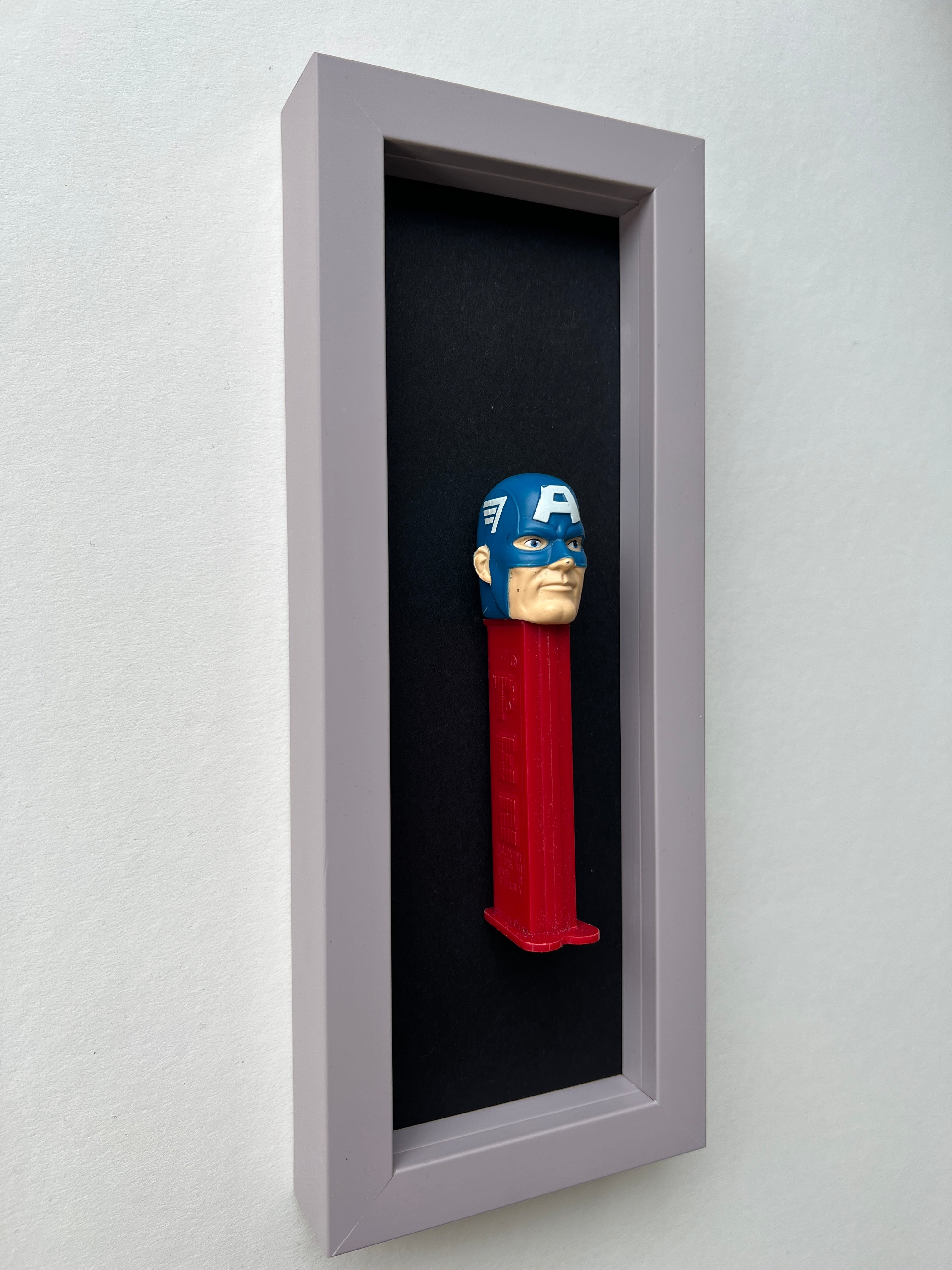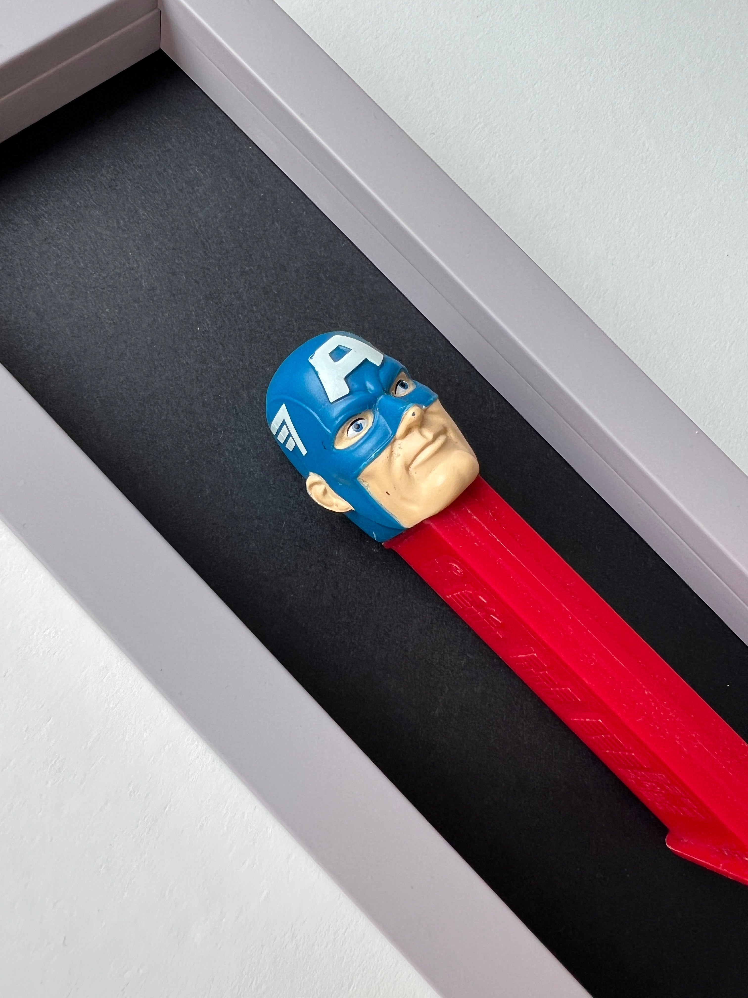 Jede Figur erzählt ihre eigene Geschichte – manche sind fast 50 Jahre alt und haben geduldig darauf gewartet, wiederentdeckt zu werden. Als wir die ersten PEZ-Spender auf einem Flohmarkt fanden, war sofort klar: Diese kleinen Schätze verdienen eine Bühne. Nach viel Tüftelei, dem Mix aus ausgewählten Materialien und liebevoller Handarbeit sind sie nun da – kleine Helden, kunstvoll in komplementären Farben gerahmt für deine Wände!