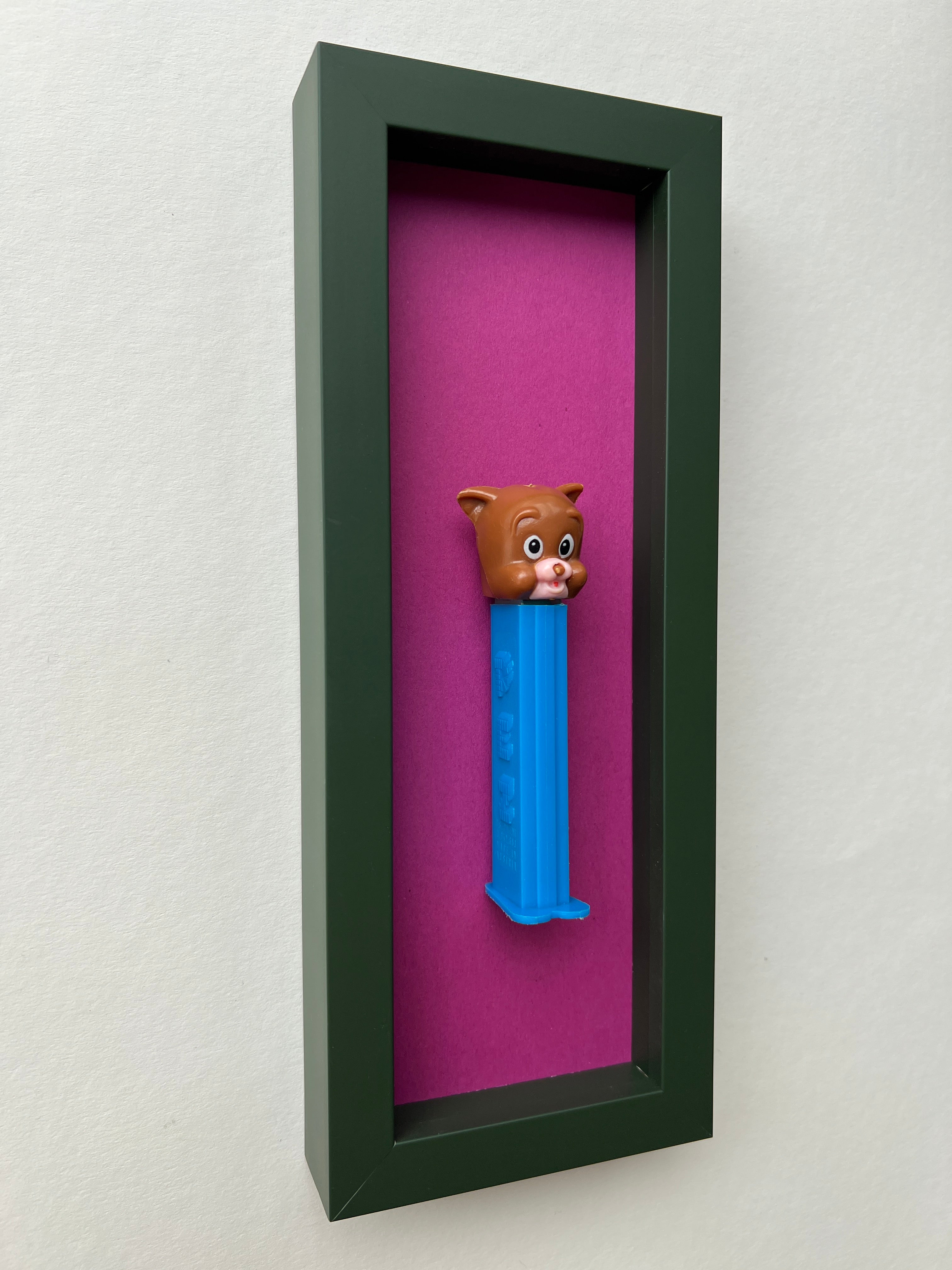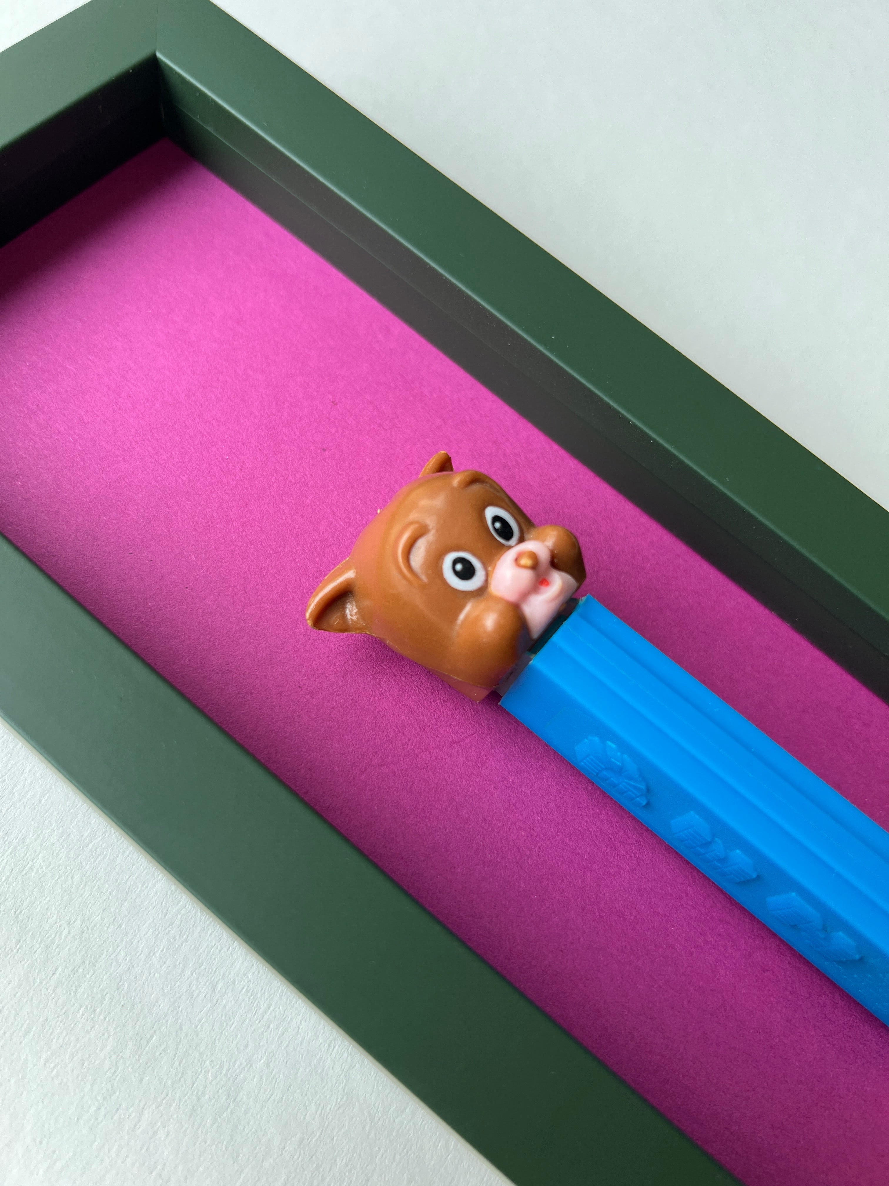 Jede Figur erzählt ihre eigene Geschichte – manche sind fast 50 Jahre alt und haben geduldig darauf gewartet, wiederentdeckt zu werden. Als wir die ersten PEZ-Spender auf einem Flohmarkt fanden, war sofort klar: Diese kleinen Schätze verdienen eine Bühne. Nach viel Tüftelei, dem Mix aus ausgewählten Materialien und liebevoller Handarbeit sind sie nun da – kleine Helden, kunstvoll in komplementären Farben gerahmt für deine Wände!