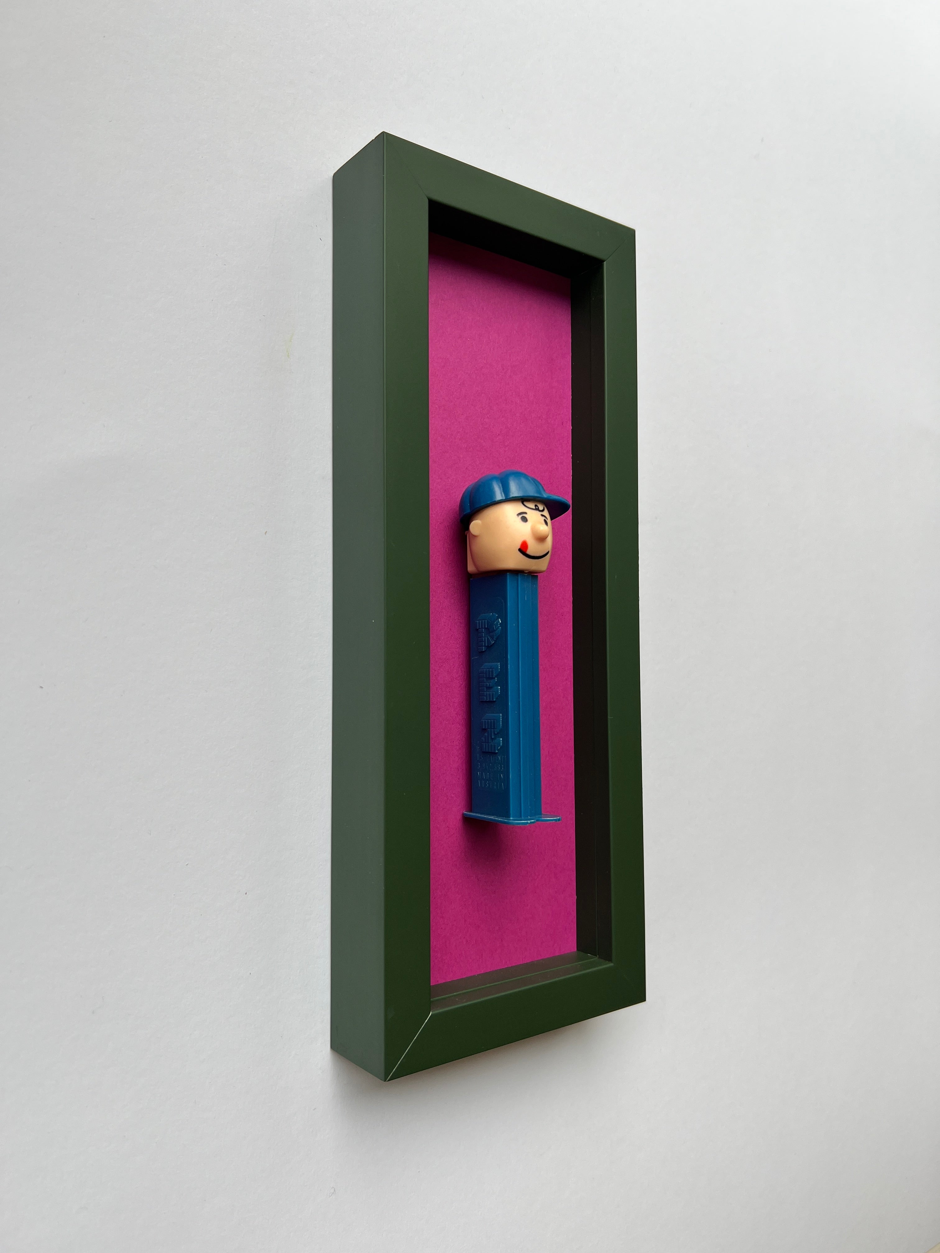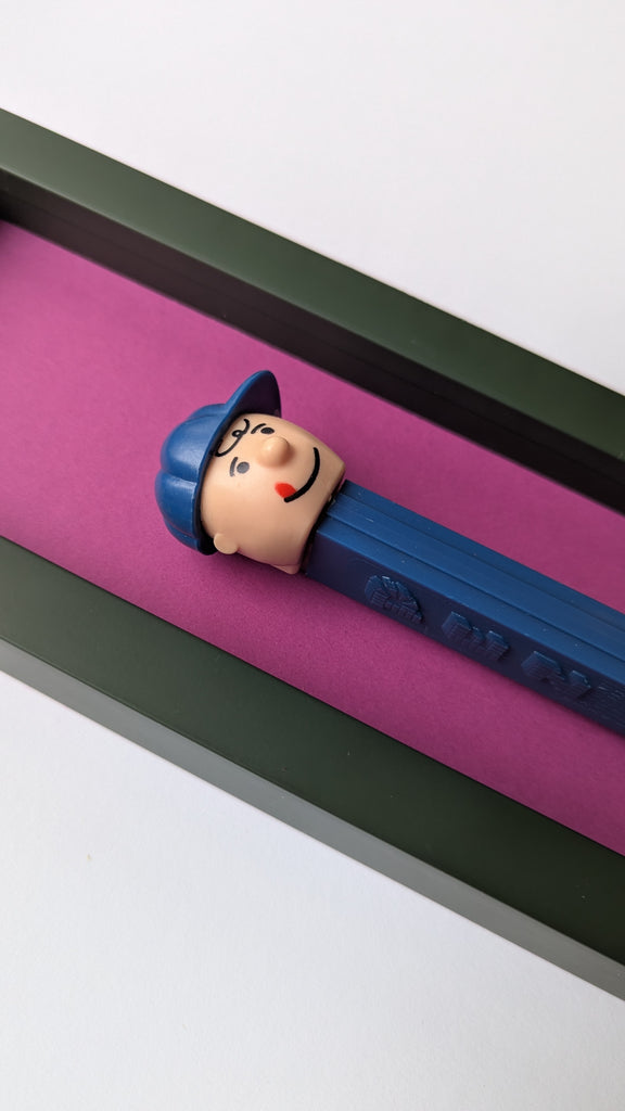 Jede Figur erzählt ihre eigene Geschichte – manche sind fast 50 Jahre alt und haben geduldig darauf gewartet, wiederentdeckt zu werden. Als wir die ersten PEZ-Spender auf einem Flohmarkt fanden, war sofort klar: Diese kleinen Schätze verdienen eine Bühne. Nach viel Tüftelei, dem Mix aus ausgewählten Materialien und liebevoller Handarbeit sind sie nun da – kleine Helden, kunstvoll in komplementären Farben gerahmt für deine Wände!