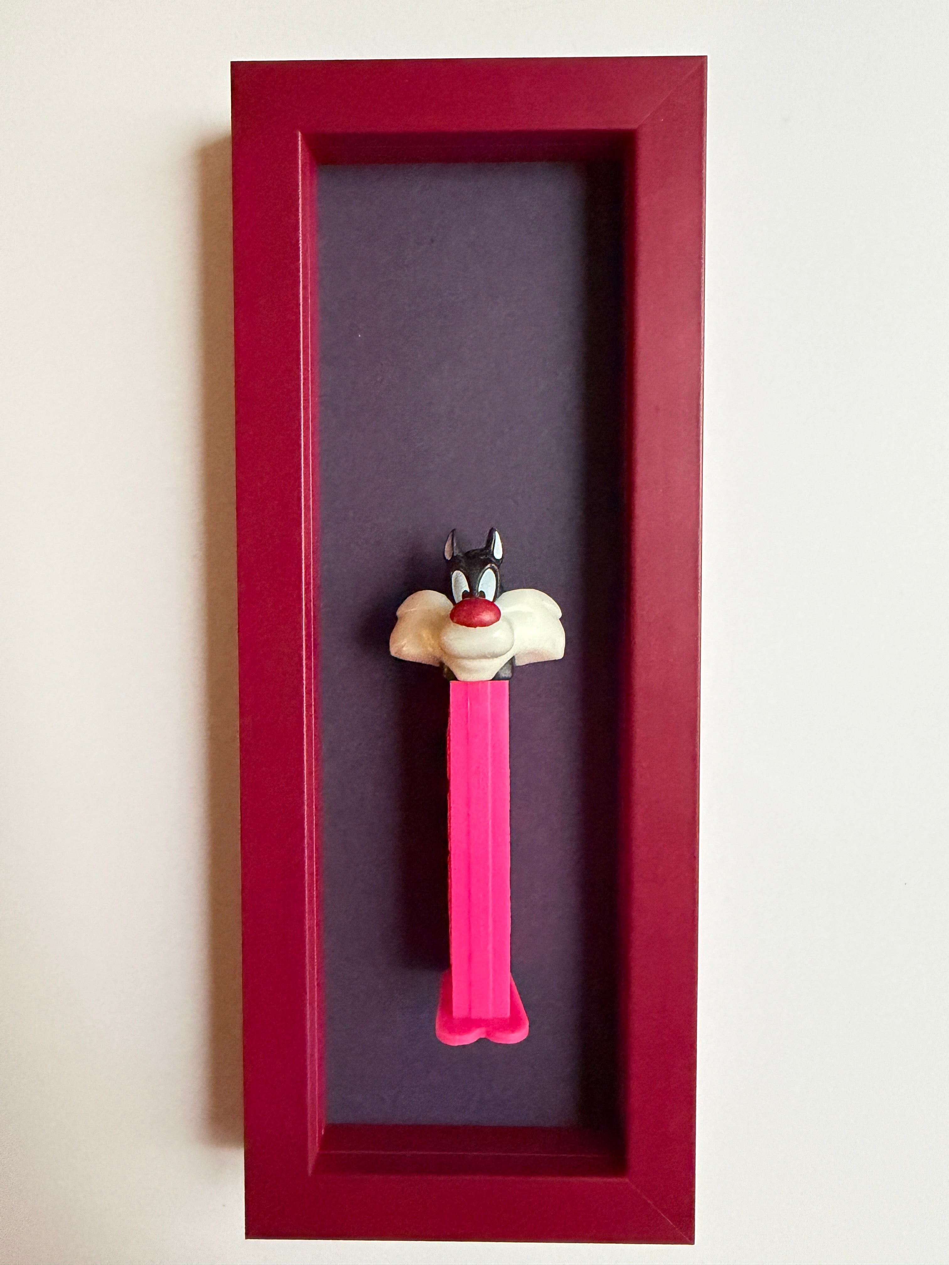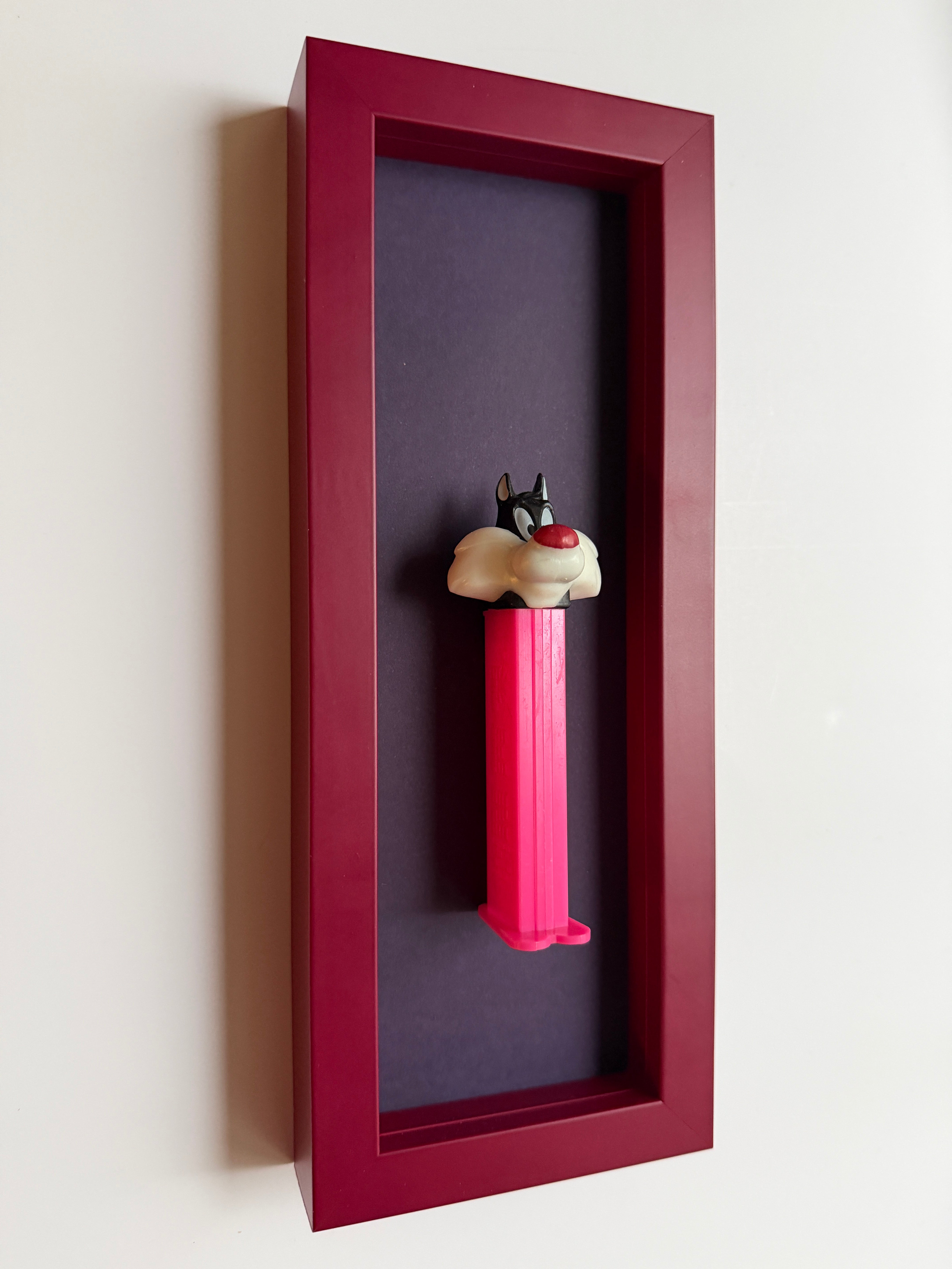 Jede Figur erzählt ihre eigene Geschichte – manche sind fast 50 Jahre alt und haben geduldig darauf gewartet, wiederentdeckt zu werden. Als wir die ersten PEZ-Spender auf einem Flohmarkt fanden, war sofort klar: Diese kleinen Schätze verdienen eine Bühne. Nach viel Tüftelei, dem Mix aus ausgewählten Materialien und liebevoller Handarbeit sind sie nun da – kleine Helden, kunstvoll in komplementären Farben gerahmt für deine Wände!
