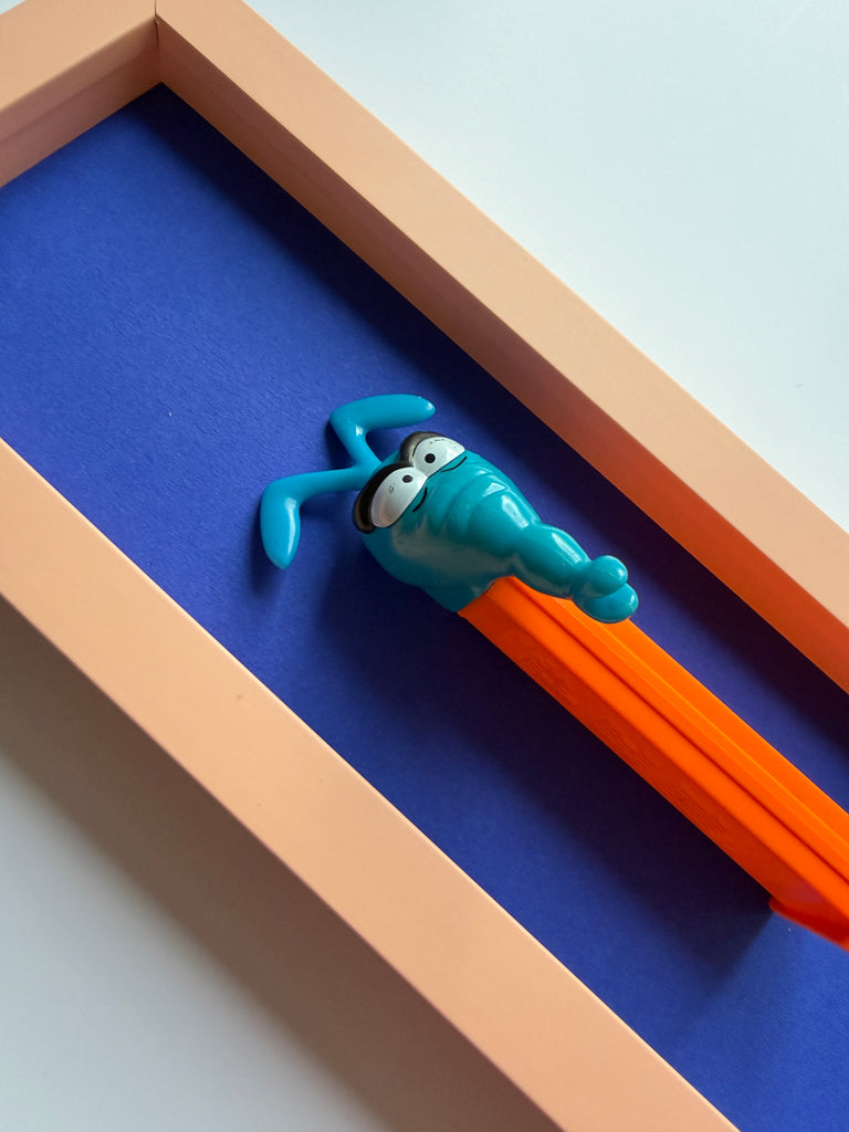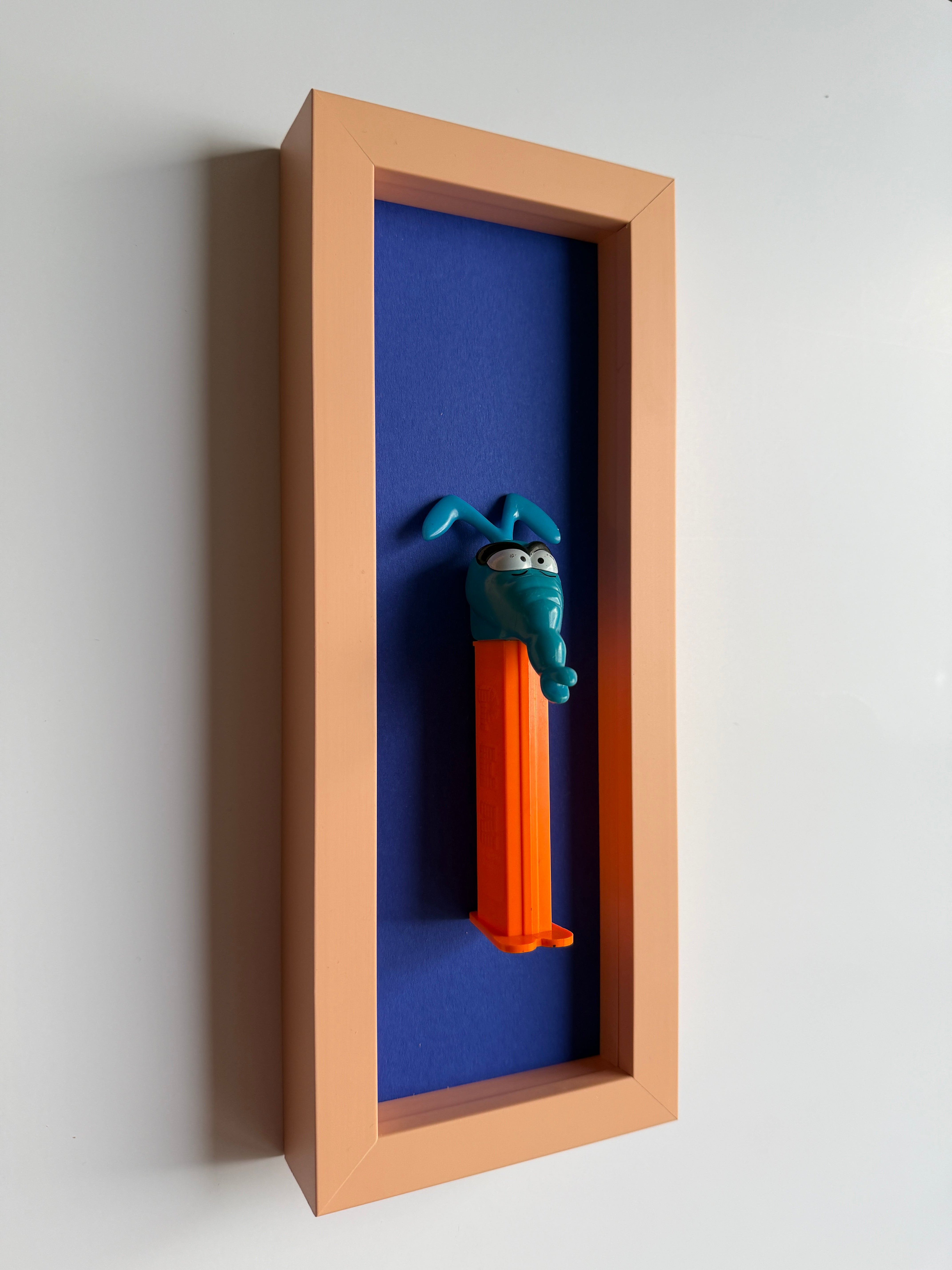 Jede Figur erzählt ihre eigene Geschichte – manche sind fast 50 Jahre alt und haben geduldig darauf gewartet, wiederentdeckt zu werden. Als wir die ersten PEZ-Spender auf einem Flohmarkt fanden, war sofort klar: Diese kleinen Schätze verdienen eine Bühne. Nach viel Tüftelei, dem Mix aus ausgewählten Materialien und liebevoller Handarbeit sind sie nun da – kleine Helden, kunstvoll in komplementären Farben gerahmt für deine Wände!