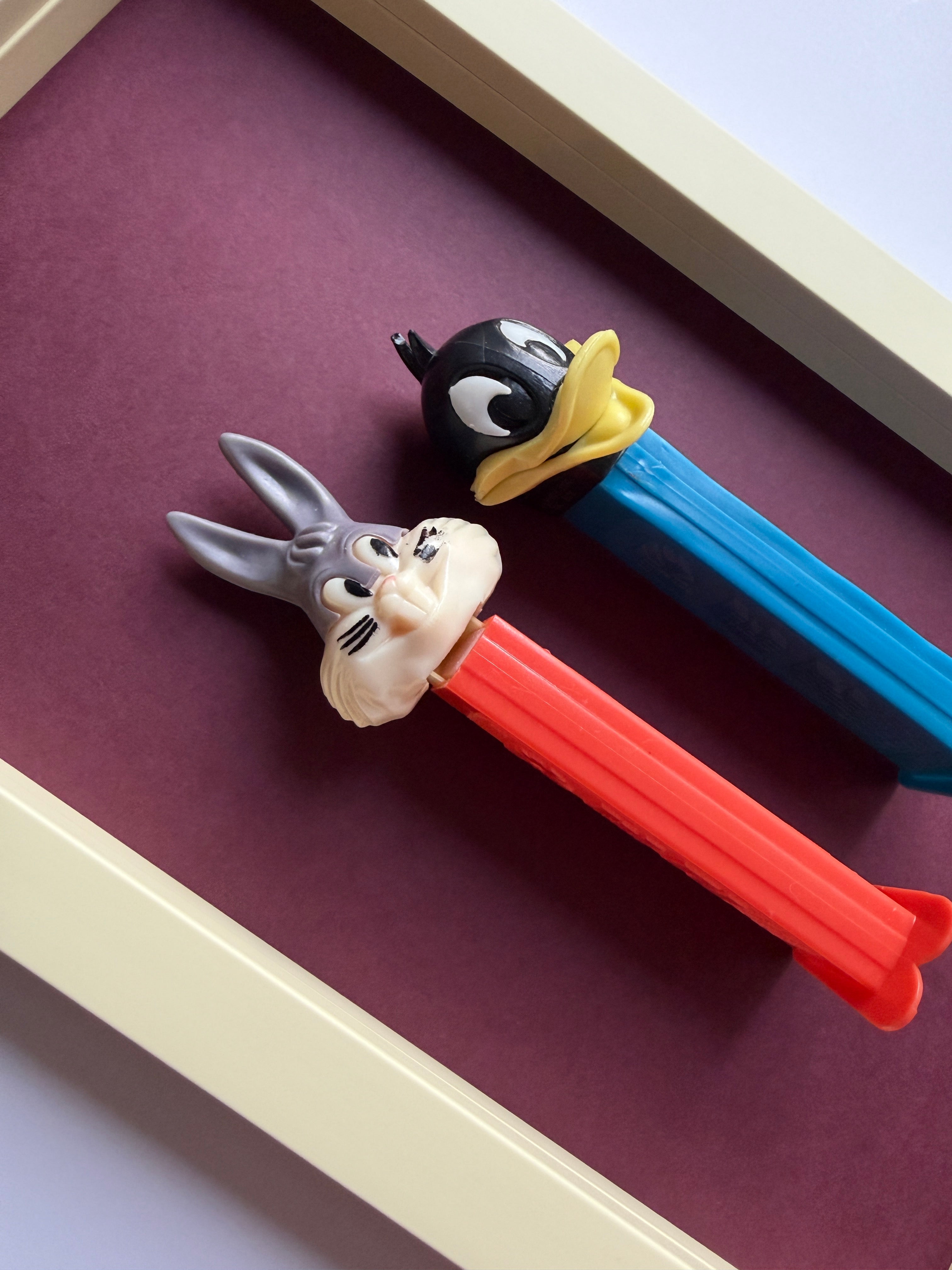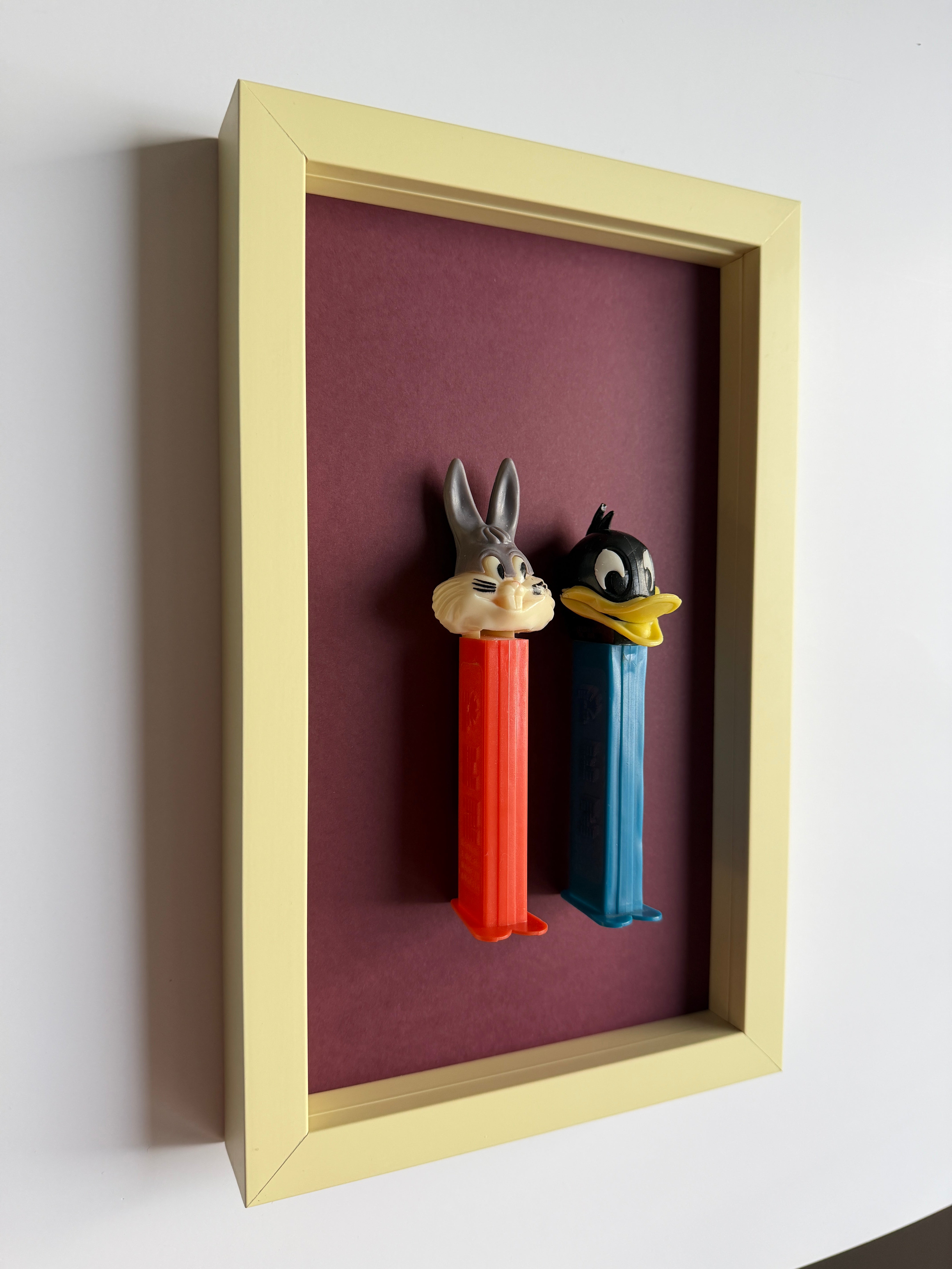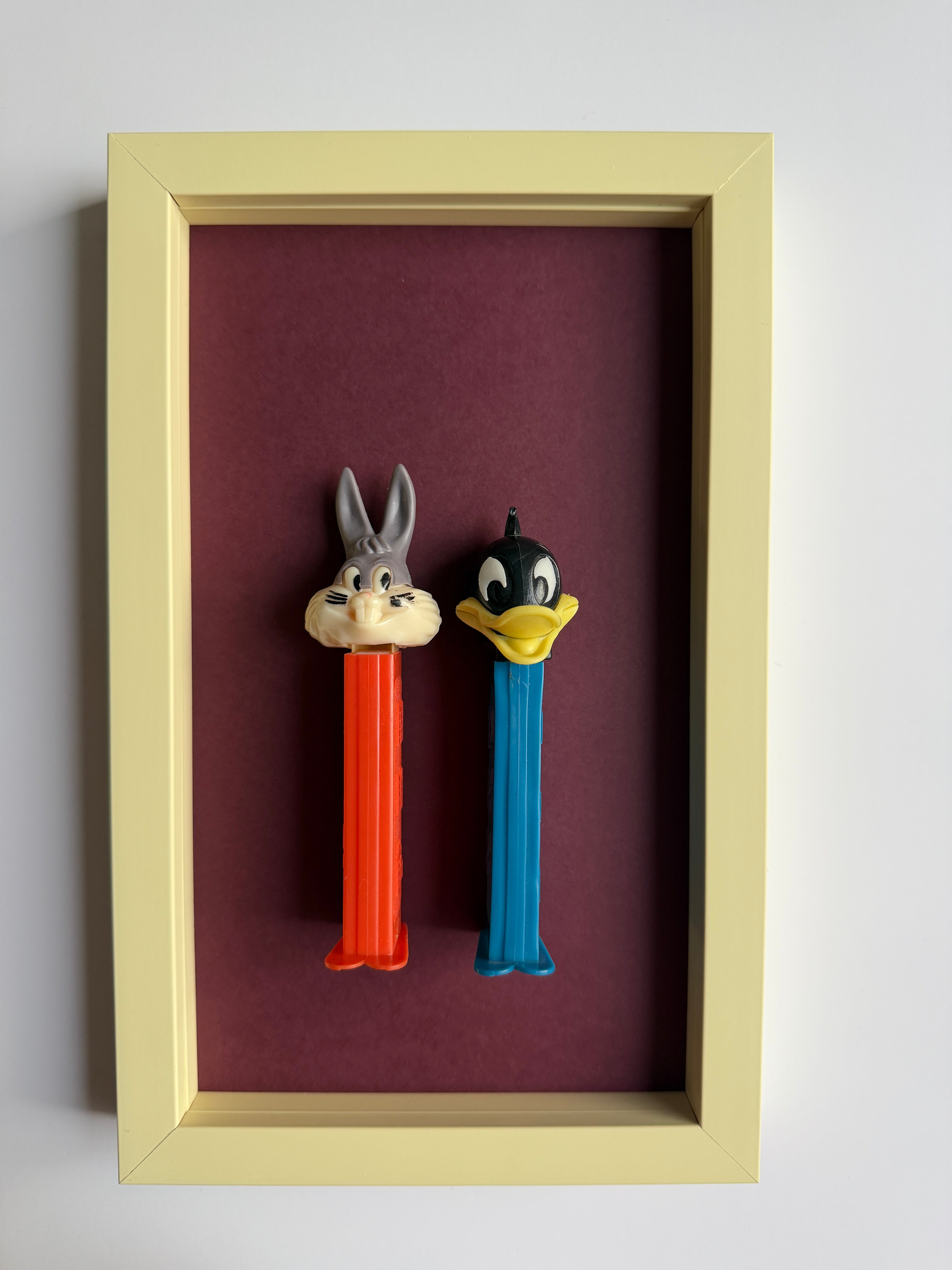 Jede Figur erzählt ihre eigene Geschichte – manche sind fast 50 Jahre alt und haben geduldig darauf gewartet, wiederentdeckt zu werden. Als wir die ersten PEZ-Spender auf einem Flohmarkt fanden, war sofort klar: Diese kleinen Schätze verdienen eine Bühne. Nach viel Tüftelei, dem Mix aus ausgewählten Materialien und liebevoller Handarbeit sind sie nun da – kleine Helden, kunstvoll in komplementären Farben gerahmt für deine Wände!