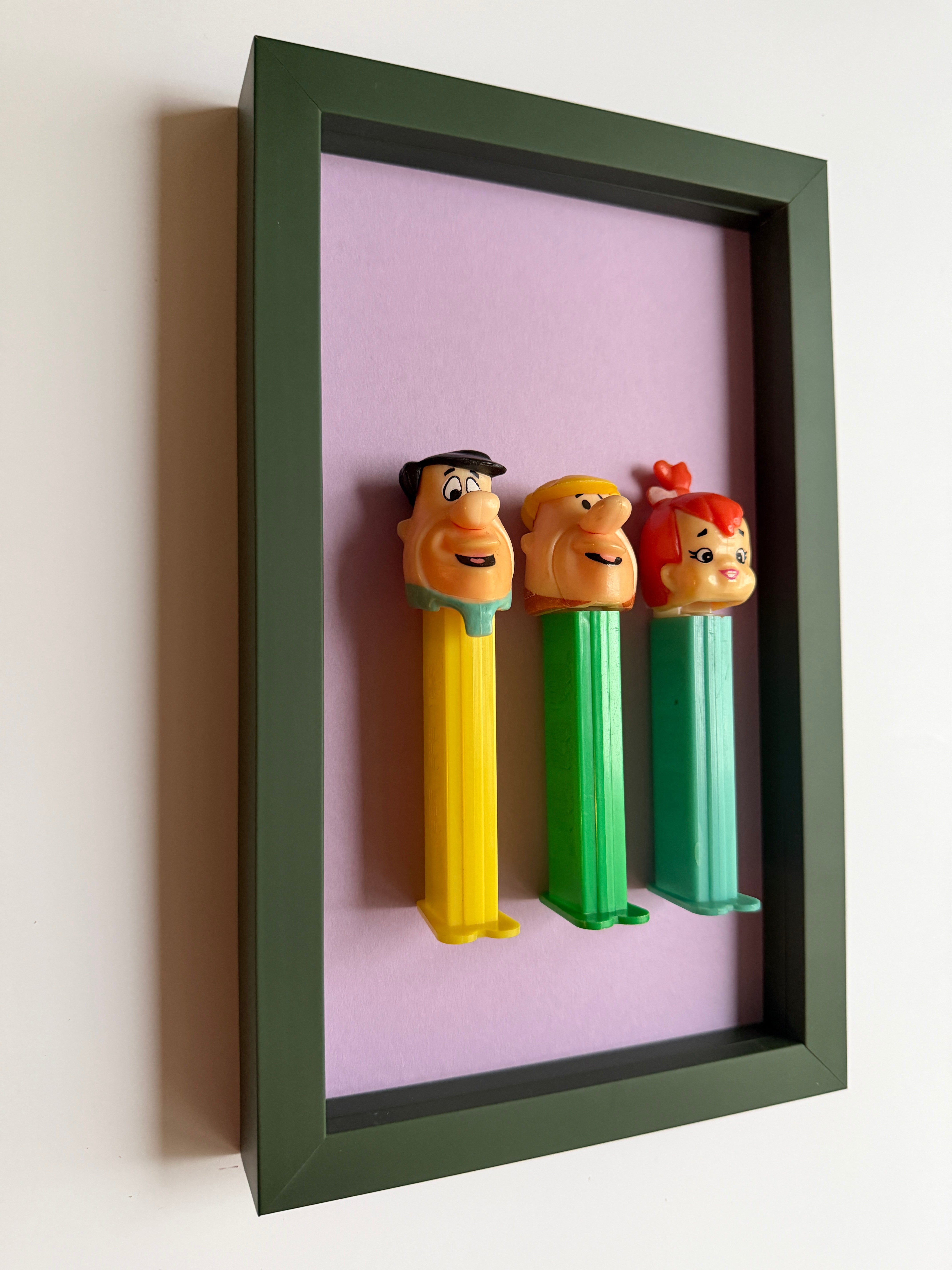 Jede Figur erzählt ihre eigene Geschichte – manche sind fast 50 Jahre alt und haben geduldig darauf gewartet, wiederentdeckt zu werden. Als wir die ersten PEZ-Spender auf einem Flohmarkt fanden, war sofort klar: Diese kleinen Schätze verdienen eine Bühne. Nach viel Tüftelei, dem Mix aus ausgewählten Materialien und liebevoller Handarbeit sind sie nun da – kleine Helden, kunstvoll in komplementären Farben gerahmt für deine Wände!
