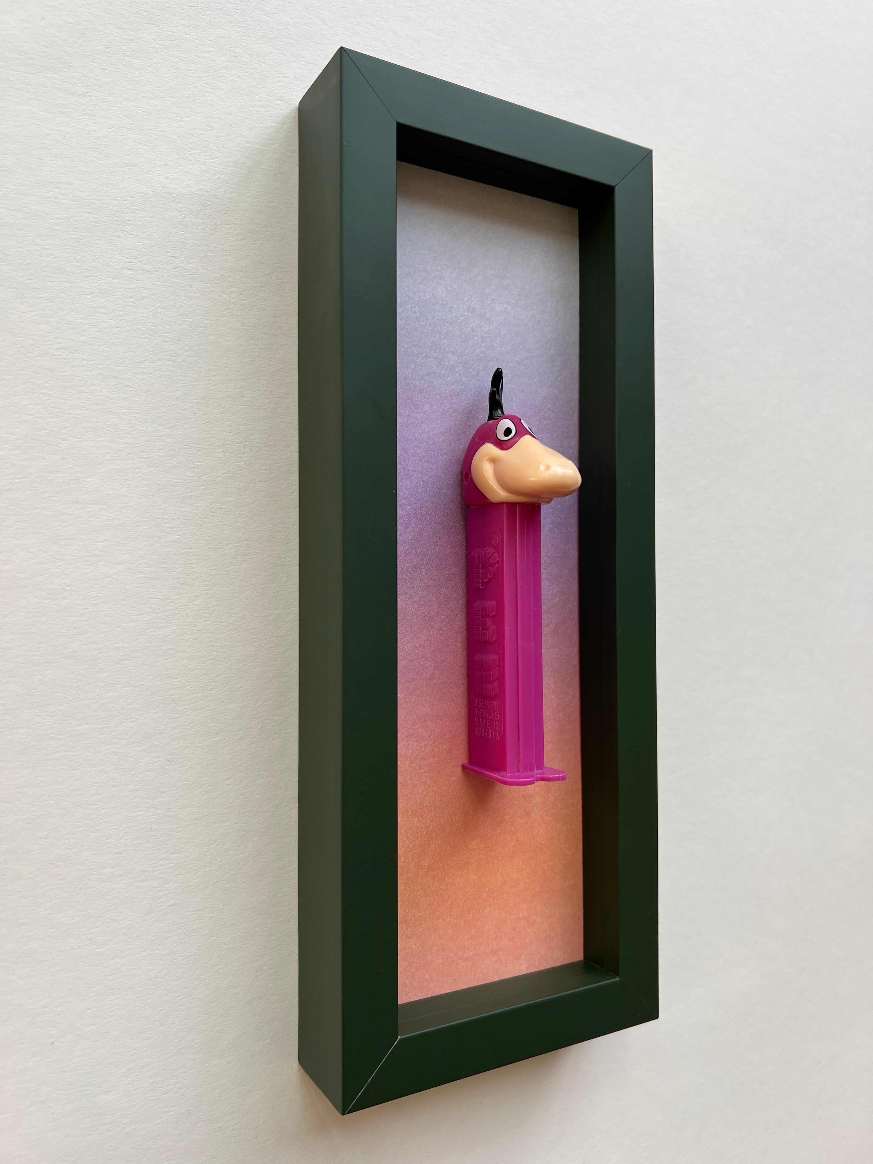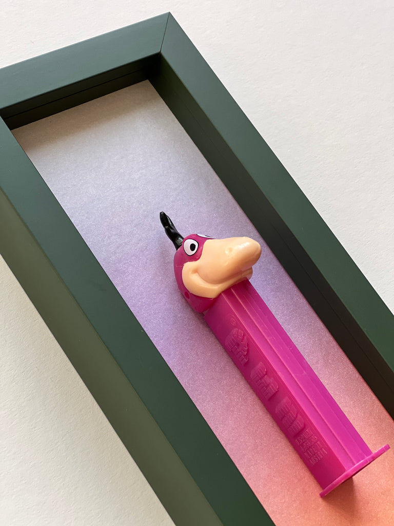 Jede Figur erzählt ihre eigene Geschichte – manche sind fast 50 Jahre alt und haben geduldig darauf gewartet, wiederentdeckt zu werden. Als wir die ersten PEZ-Spender auf einem Flohmarkt fanden, war sofort klar: Diese kleinen Schätze verdienen eine Bühne. Nach viel Tüftelei, dem Mix aus ausgewählten Materialien und liebevoller Handarbeit sind sie nun da – kleine Helden, kunstvoll in komplementären Farben gerahmt für deine Wände!