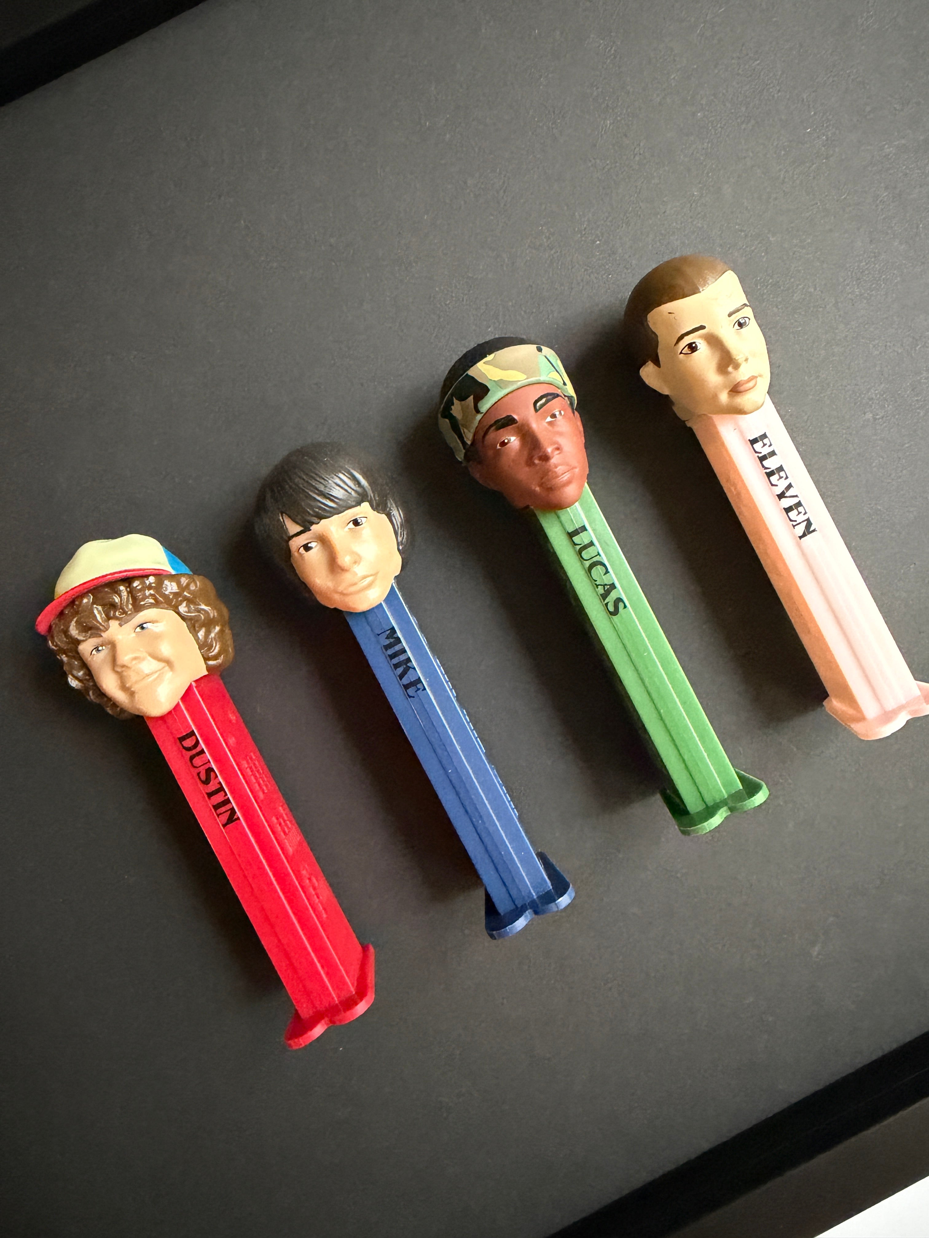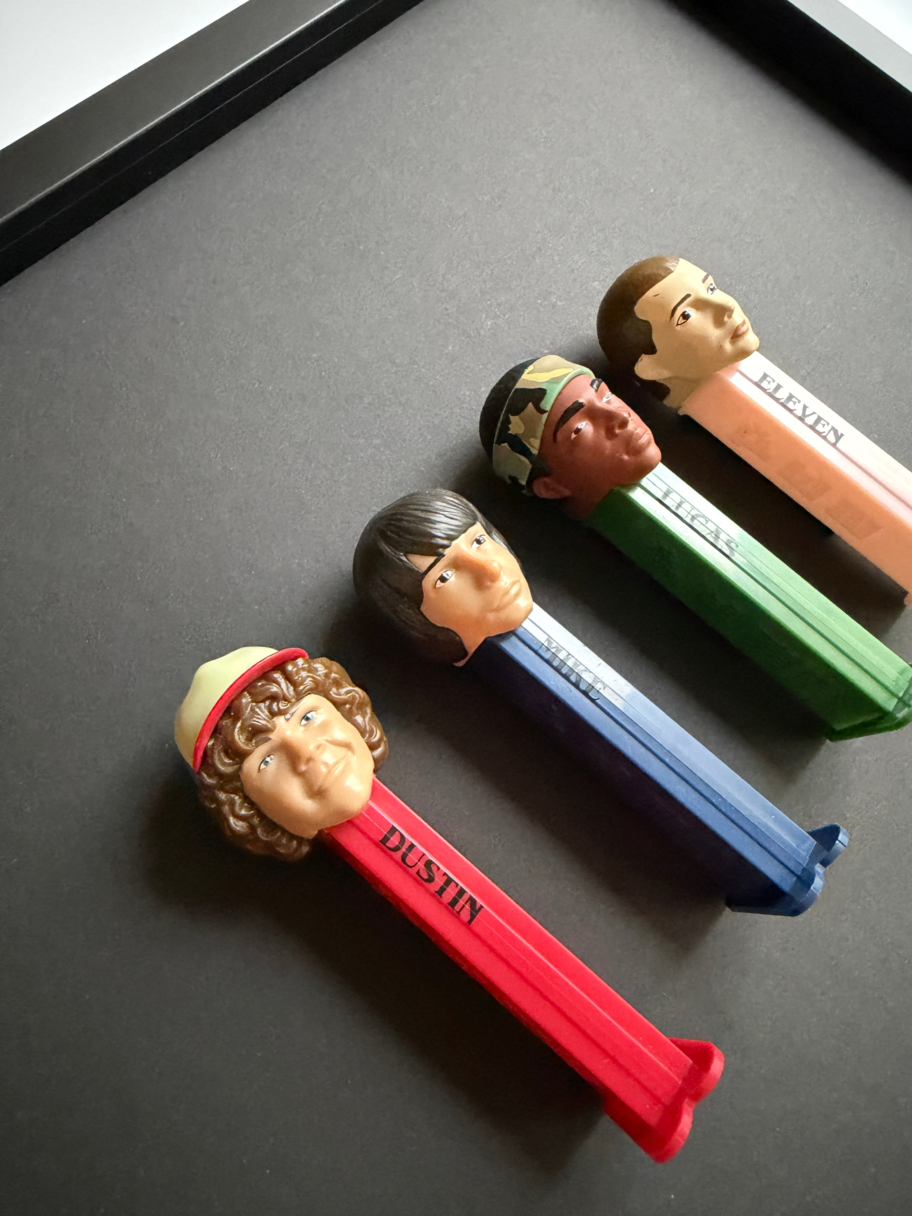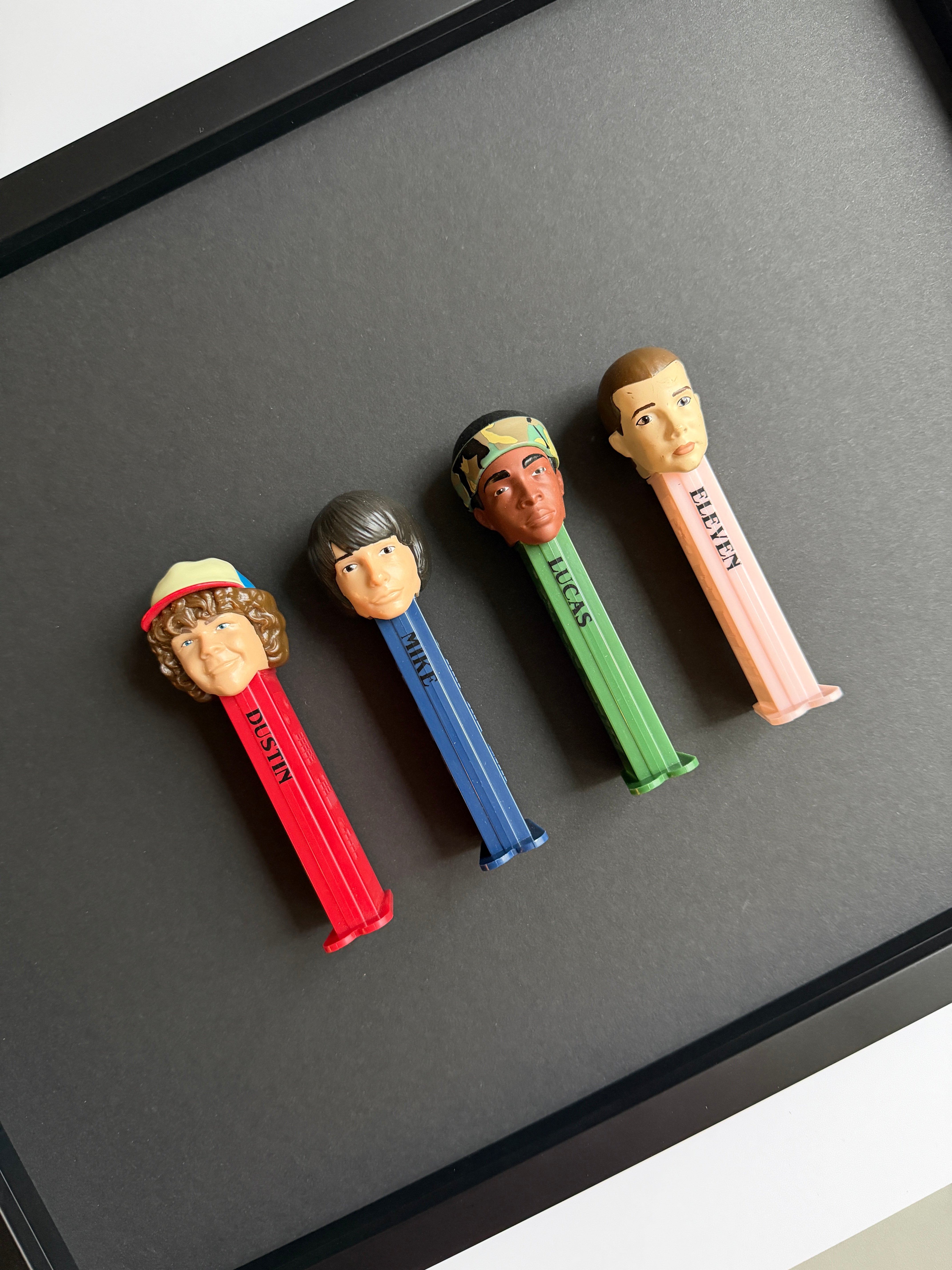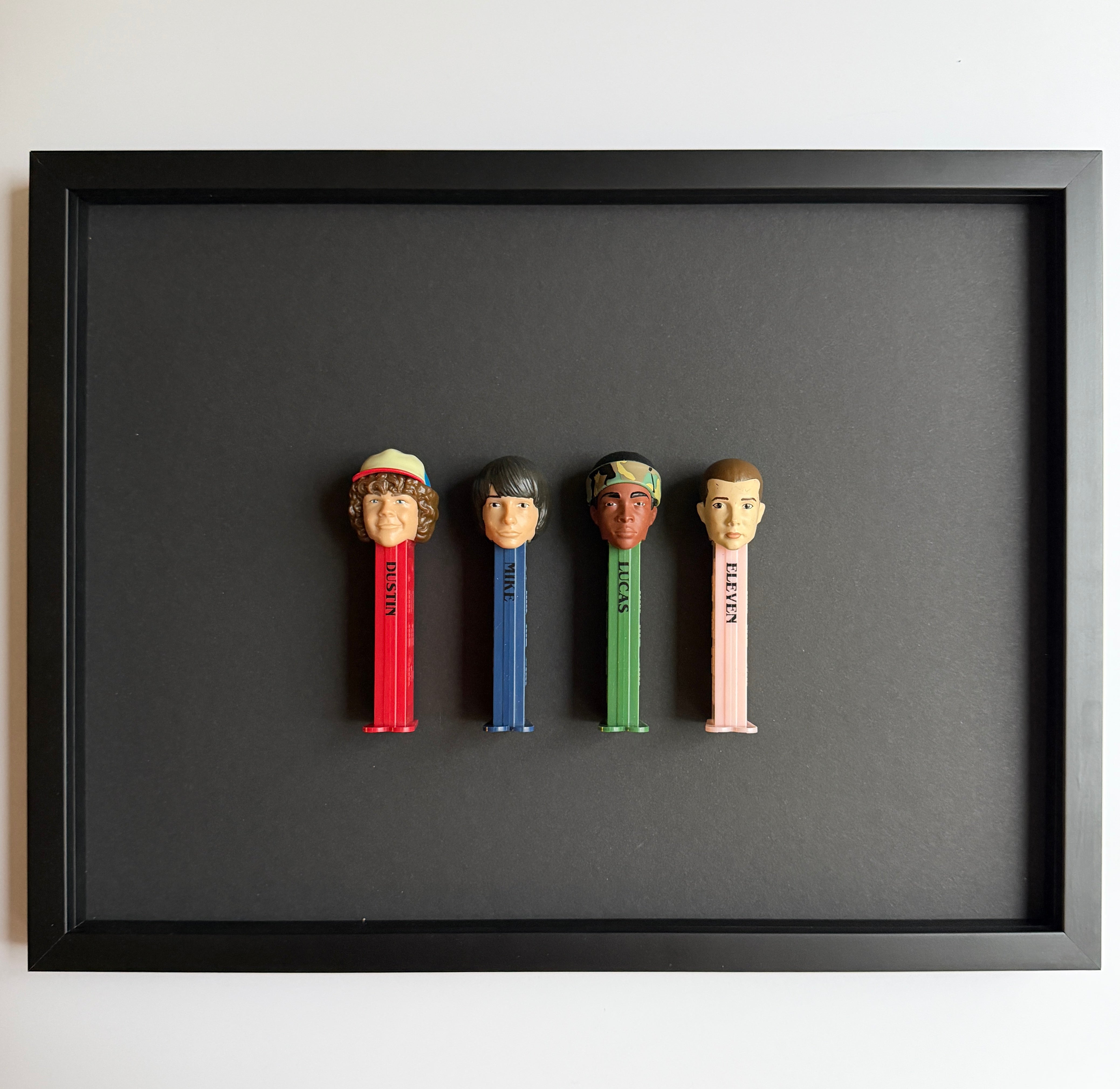Jede Figur erzählt ihre eigene Geschichte – manche sind fast 50 Jahre alt und haben geduldig darauf gewartet, wiederentdeckt zu werden. Als wir die ersten PEZ-Spender auf einem Flohmarkt fanden, war sofort klar: Diese kleinen Schätze verdienen eine Bühne. Nach viel Tüftelei, dem Mix aus ausgewählten Materialien und liebevoller Handarbeit sind sie nun da – kleine Helden, kunstvoll in komplementären Farben gerahmt für deine Wände!