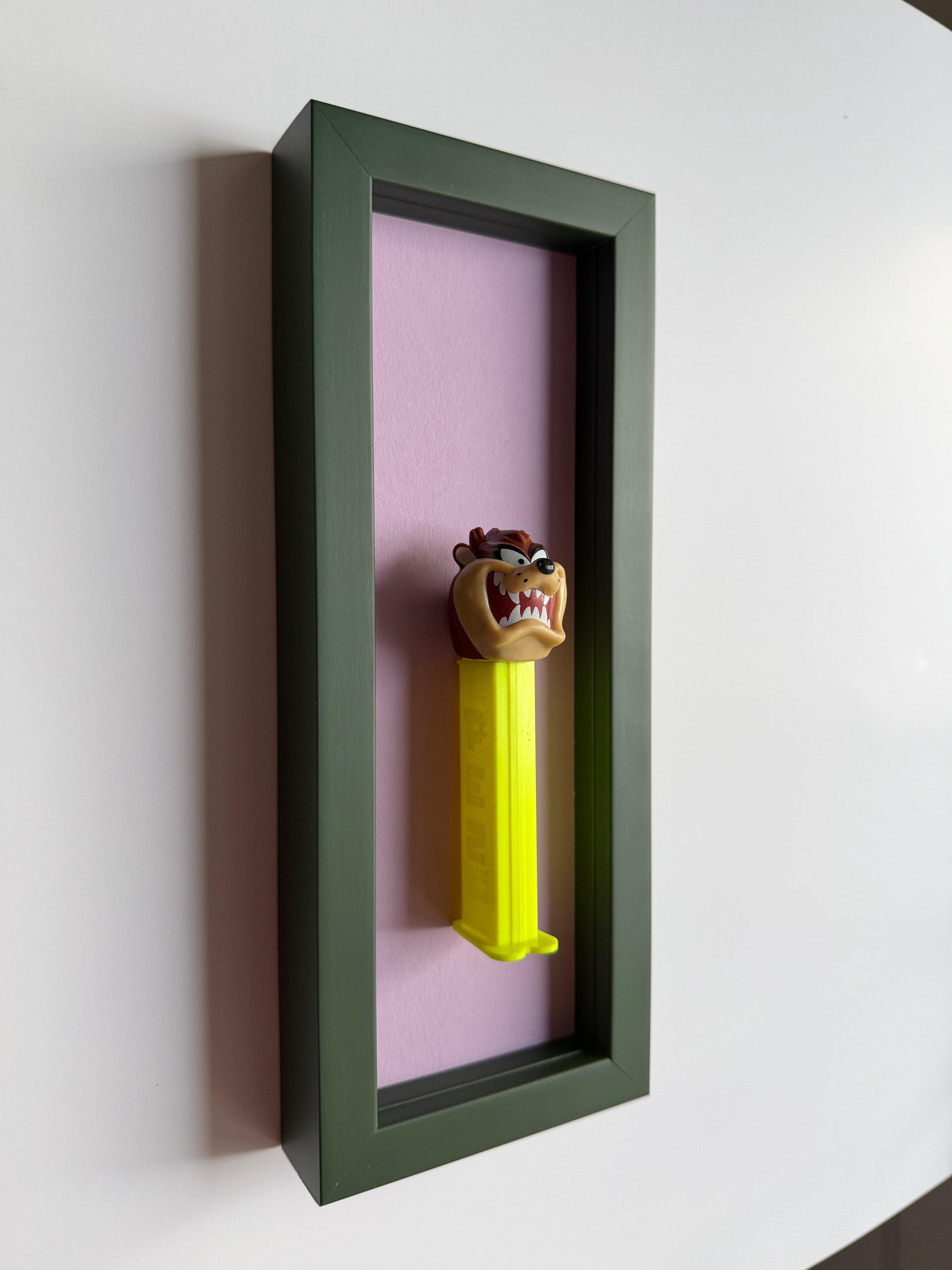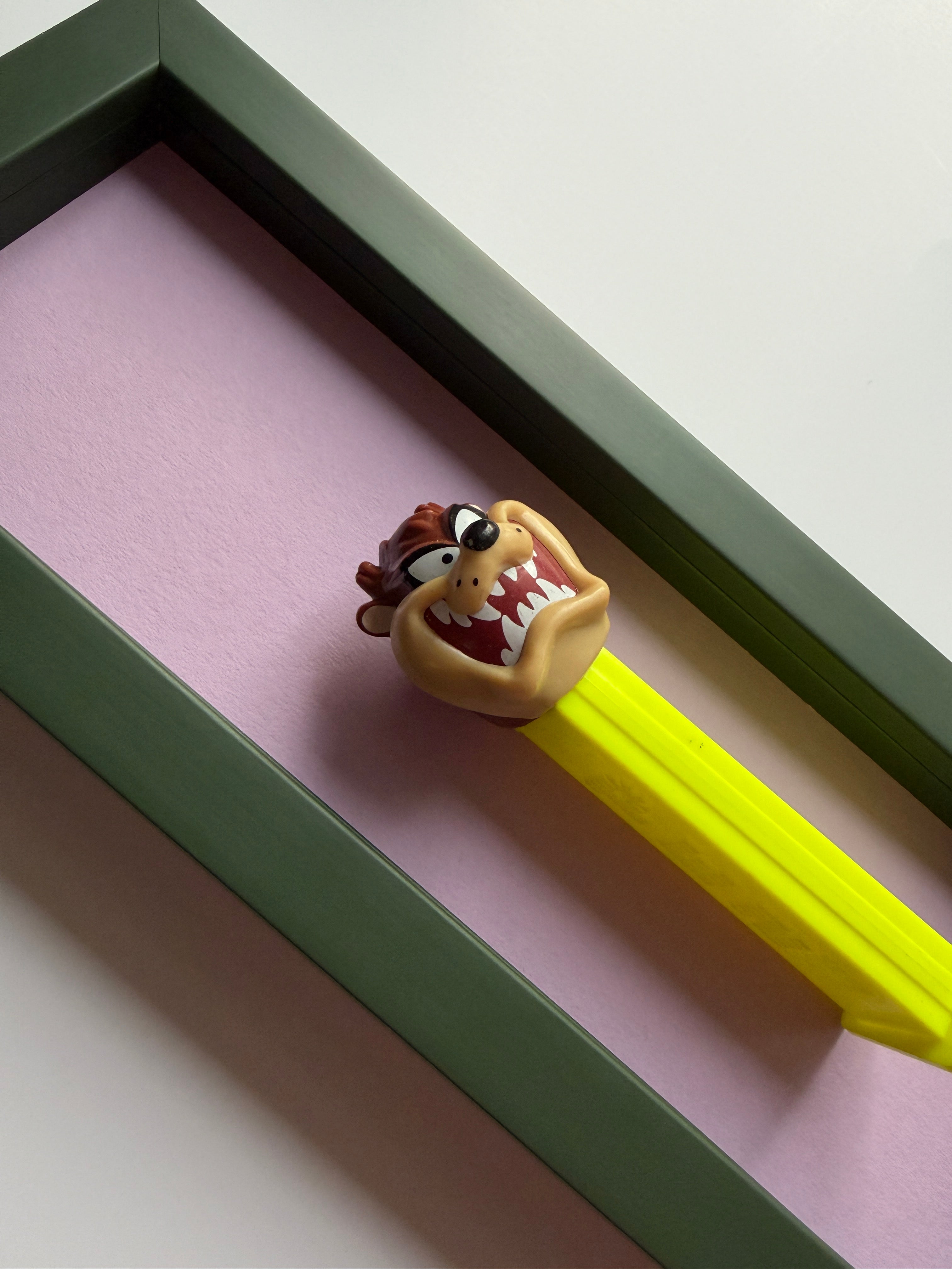 Jede Figur erzählt ihre eigene Geschichte – manche sind fast 50 Jahre alt und haben geduldig darauf gewartet, wiederentdeckt zu werden. Als wir die ersten PEZ-Spender auf einem Flohmarkt fanden, war sofort klar: Diese kleinen Schätze verdienen eine Bühne. Nach viel Tüftelei, dem Mix aus ausgewählten Materialien und liebevoller Handarbeit sind sie nun da – kleine Helden, kunstvoll in komplementären Farben gerahmt für deine Wände!
