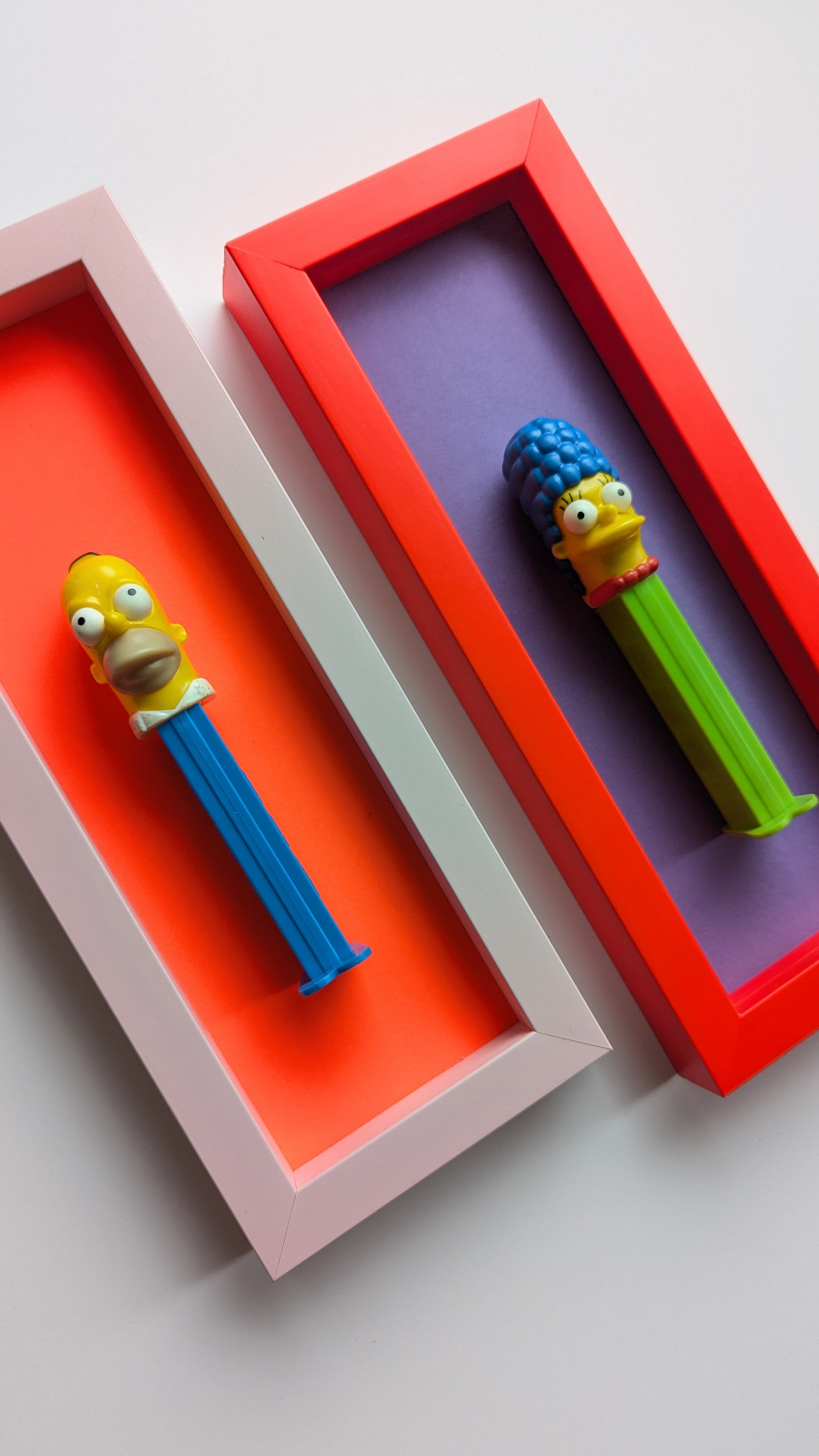 Jede Figur erzählt ihre eigene Geschichte – manche sind fast 50 Jahre alt und haben geduldig darauf gewartet, wiederentdeckt zu werden. Als wir die ersten PEZ-Spender auf einem Flohmarkt fanden, war sofort klar: Diese kleinen Schätze verdienen eine Bühne. Nach viel Tüftelei, dem Mix aus ausgewählten Materialien und liebevoller Handarbeit sind sie nun da – kleine Helden, kunstvoll in komplementären Farben gerahmt für deine Wände!