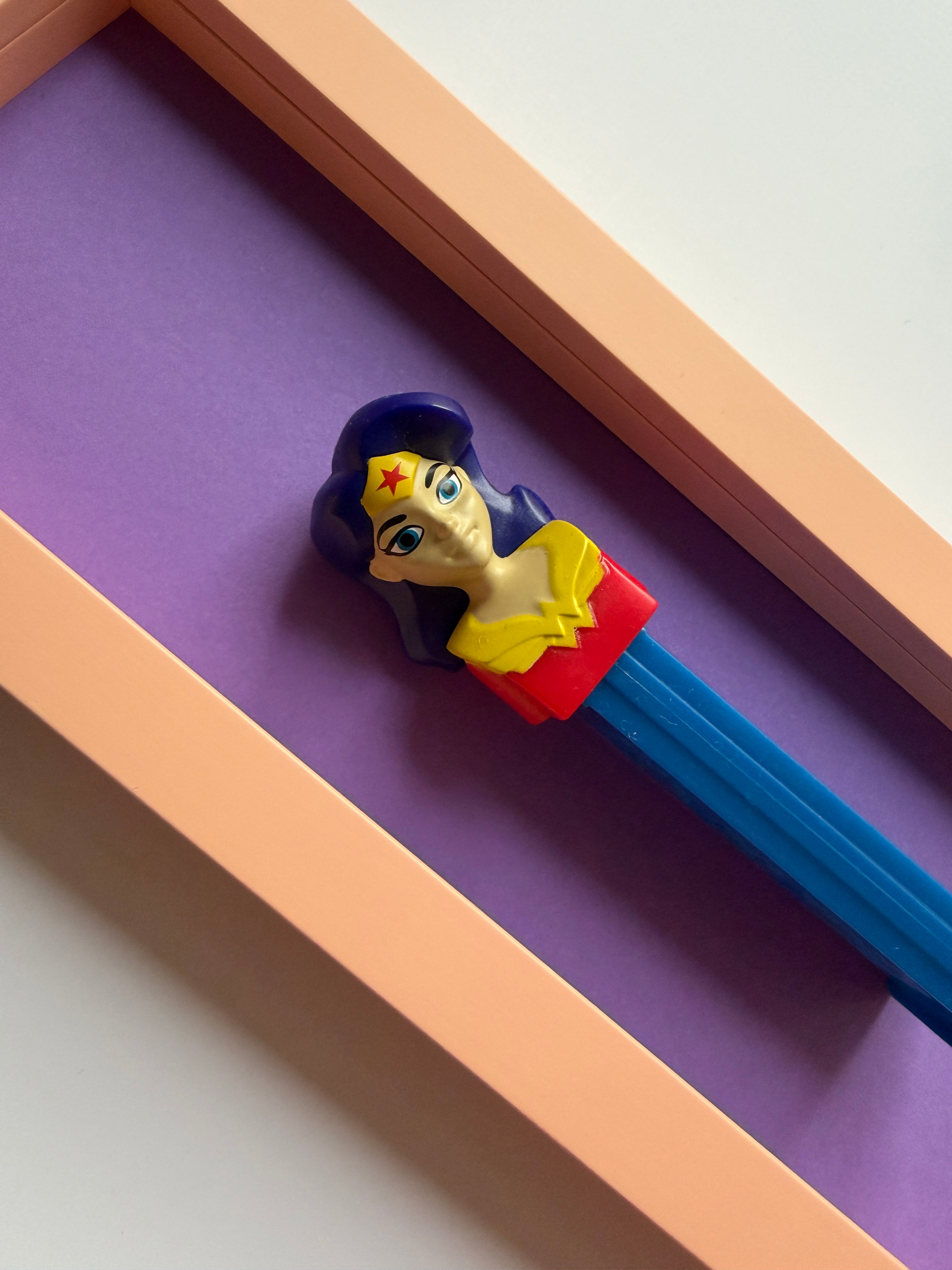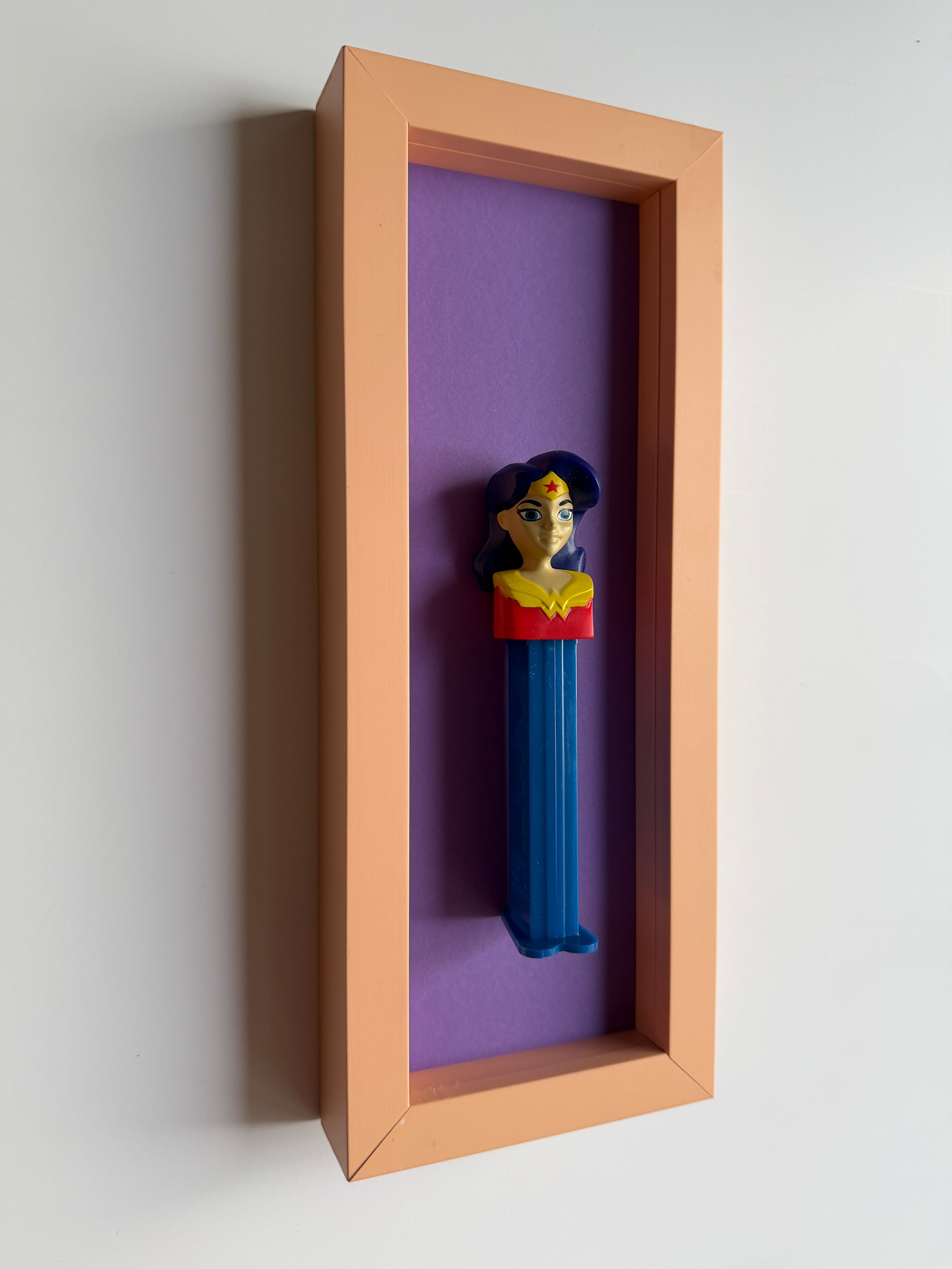 Jede Figur erzählt ihre eigene Geschichte – manche sind fast 50 Jahre alt und haben geduldig darauf gewartet, wiederentdeckt zu werden. Als wir die ersten PEZ-Spender auf einem Flohmarkt fanden, war sofort klar: Diese kleinen Schätze verdienen eine Bühne. Nach viel Tüftelei, dem Mix aus ausgewählten Materialien und liebevoller Handarbeit sind sie nun da – kleine Helden, kunstvoll in komplementären Farben gerahmt für deine Wände!